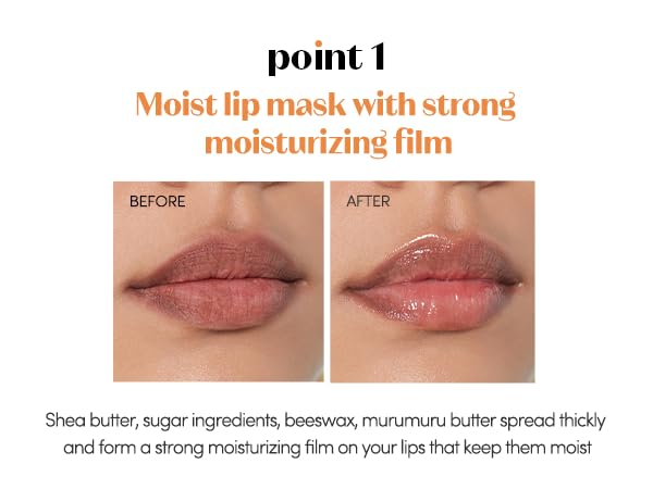 - Moist lip mask with strong moisturizing film: Shea butter, sugar ingredients, beeswax, murumuru butter spread thickly and form astrong moisturizing film on your lips that keep them moist