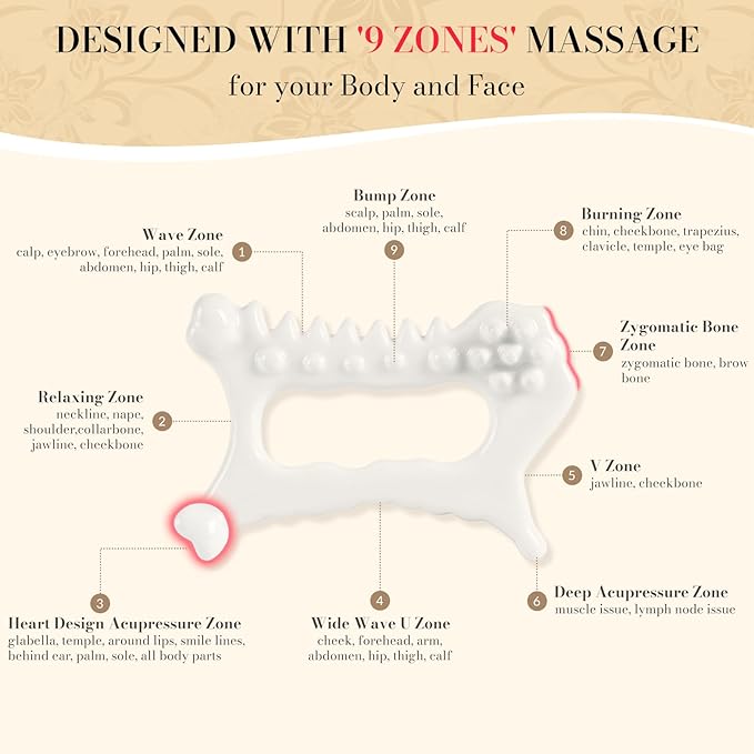 - Unique 9 in 1 Massage Zone Design: Worive body gua sha facial tool offers an innovative 9-zone circulation system. The unique Heart Design Acupressure Zone provides all body part massage. The Wave Zone and Wide Wave U Zone design provides effective lymphatic drainage trigger, swelling reducing, cellulite reducing, relieve muscle soreness, face slimmer, improves skin elasticity and skin health. The Deep Acupressure Zone provides deeper massage of acupuncture points and tissues, relaxing deeper tissues, improving blood circulation.