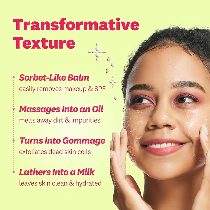 - [4 TRANSFORMATIVE TEXTURE] This cleansing balm stays a sorbet-like solid in the jar until it makes contact with skin and transforms into a silky oil (then a gommage, and then milky lather!). Non-comedogenic.