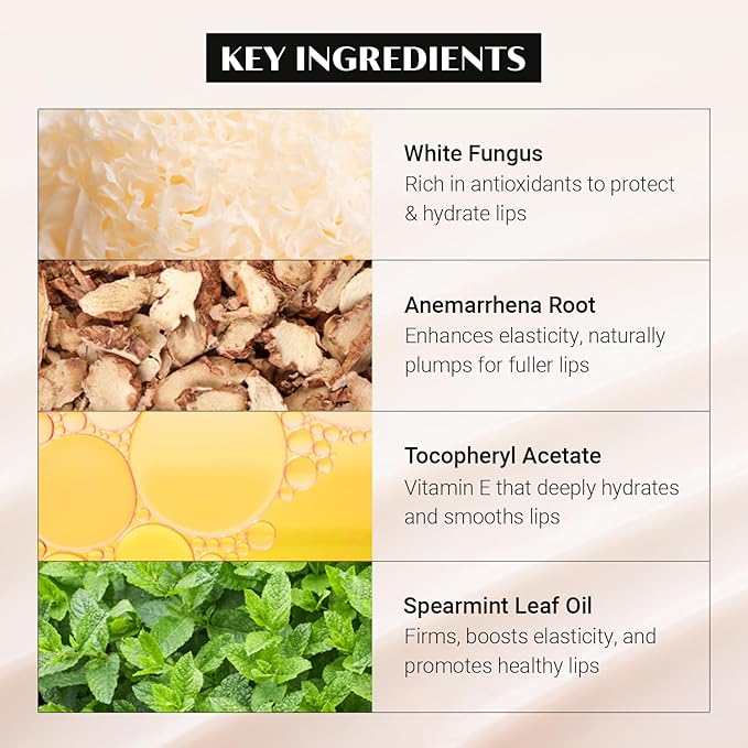 - Nourishing Formula with Natural Ingredients: Tocopherol (Vitamin E) and Anemarrhena Root Extract combat aging and improve elasticity, Hydrogenated Castor Oil and Coconut Oil add volume and firmness, while Petrolatum, White Fungus Extract, and Spearmint Leaf Oil lock in moisture, reduce peeling, and soothe lips.