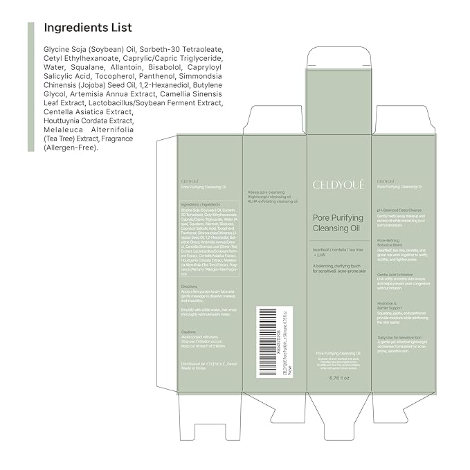 Pore Purifying Cleansing Oil β Korean Face Wash with Centella, Tea Tree, Green Tea & LHA β Gentle Makeup Remover for Sensitive, Acne-Prone Skin, Deep Pore Cleanser, 6.76 fl oz